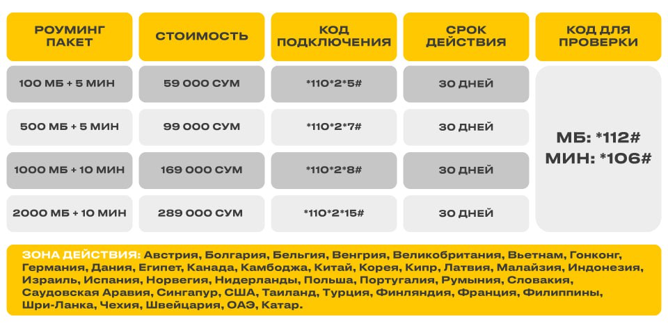 Подключайте роуминг-пакеты Sayohat для 85 стран: еще больше интернета и минут по прежним ценам. Для самых активных путешественников доступен новый пакет с максимальным объёмом минут и гигабайт.