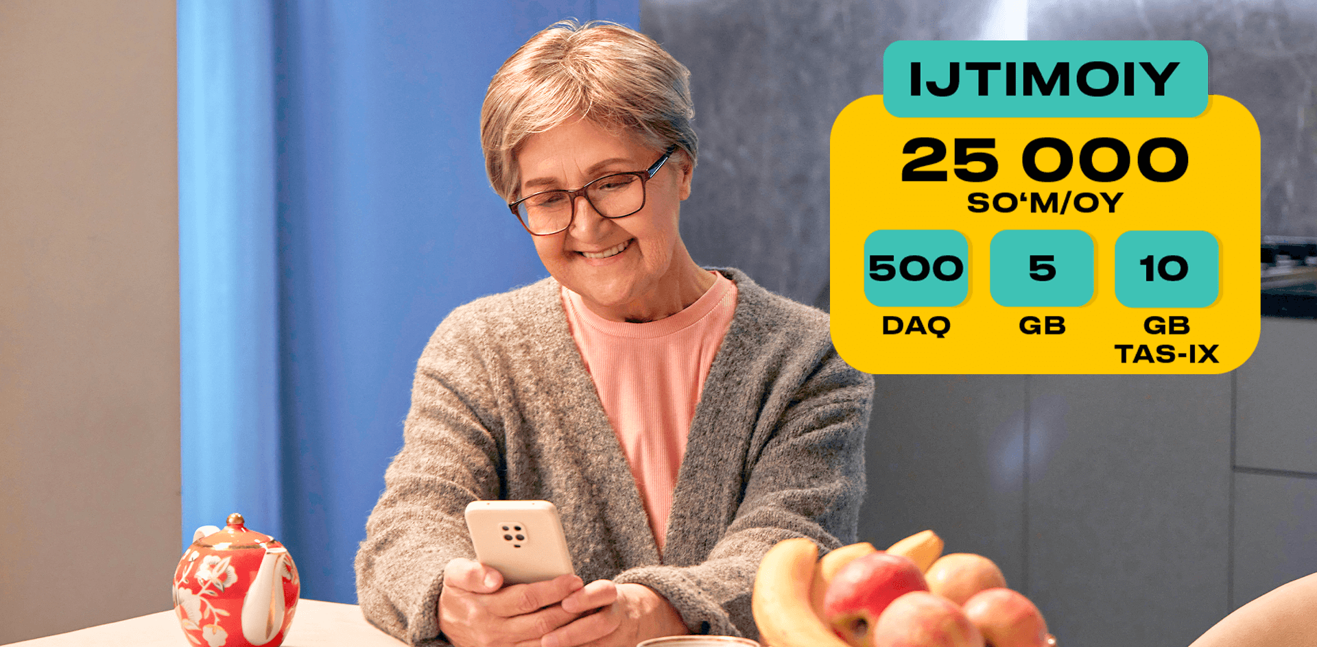 “Ijtimoiy“ tarifi pensionerlar, faxriylar va imkoniyati cheklangan shaxslar uchun oila va do‘stlar bilan oson va qulay narxda aloqada bo‘lish imkonini beradi.